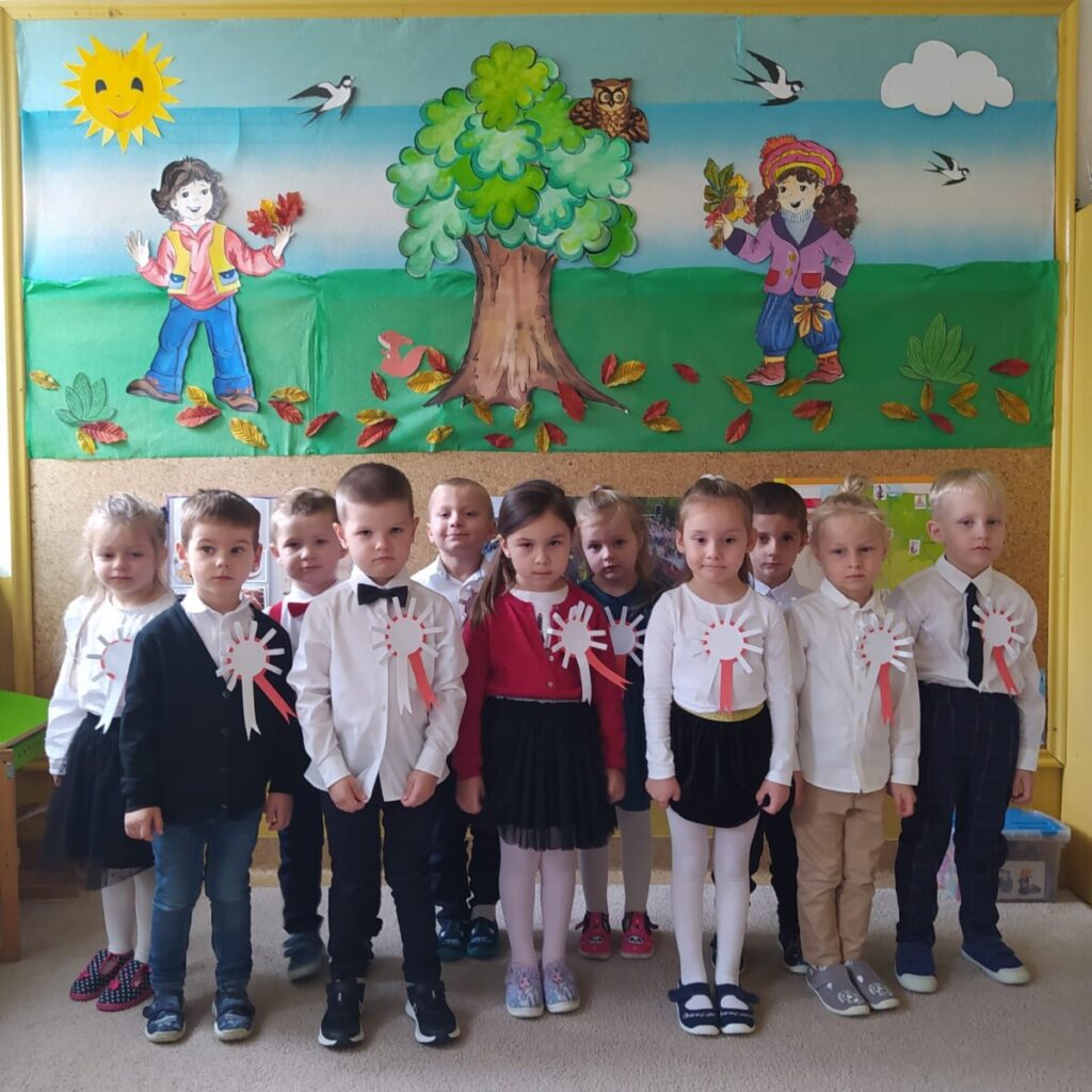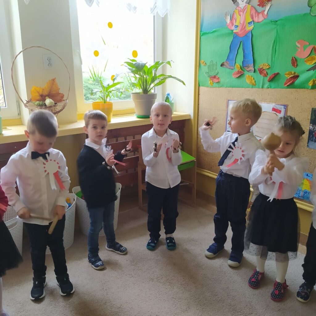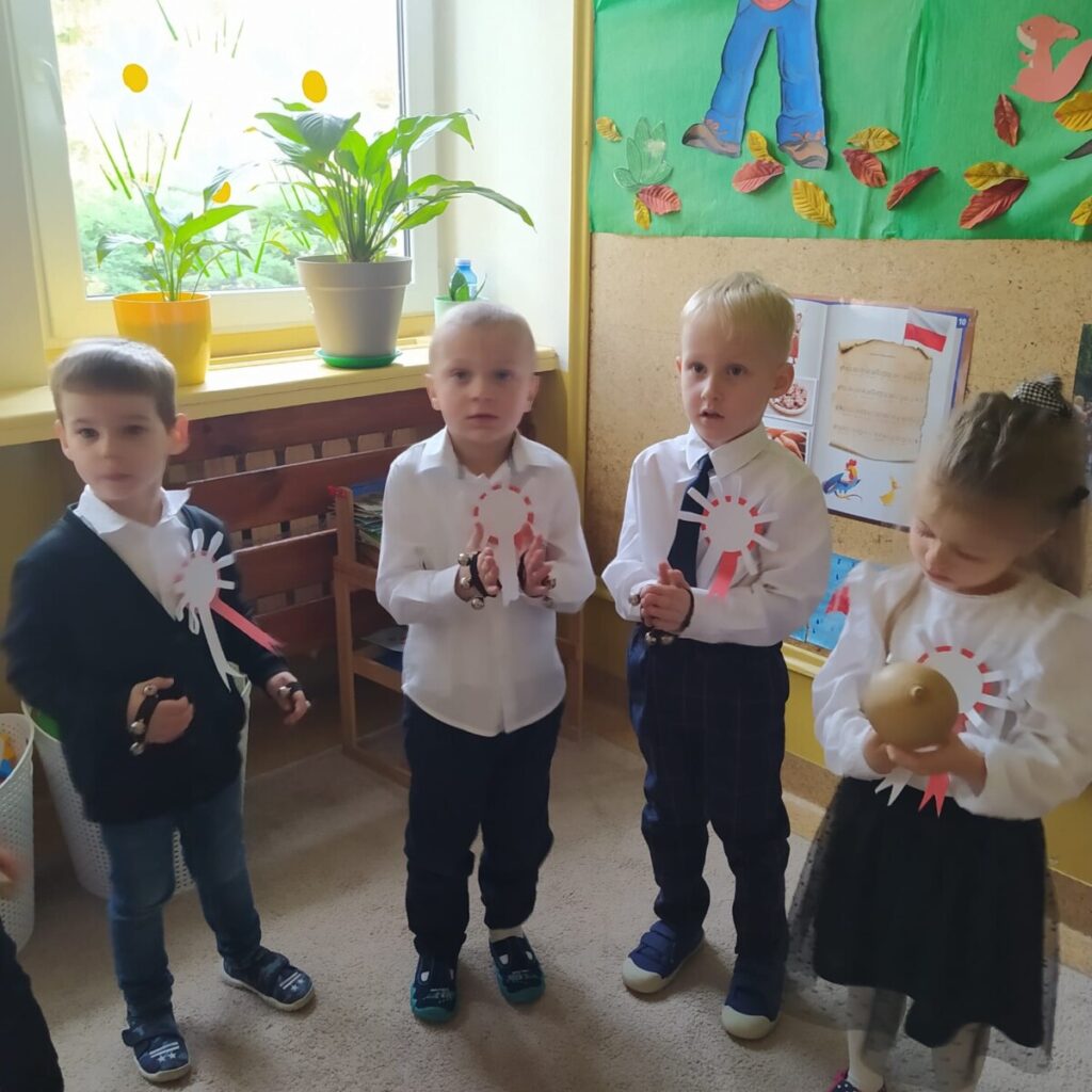 W związku z obchodem Świata Niepodległości dzieci obejrzały film edukacyjny „Narodowe Święto Niepodległości”, zostały zapoznaje z symbolami narodowymi i zrobiły chorągiewki w barwach narodowych. W dniu uroczystości zaśpiewały Hymn Polski i zaprezentowały utwór muzyczny wykonany na instrumentach perkusyjnych.