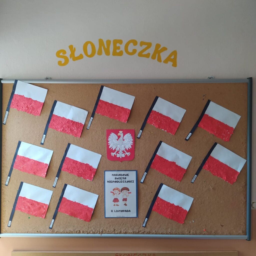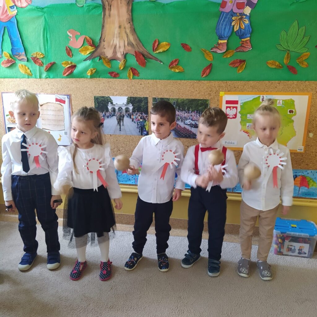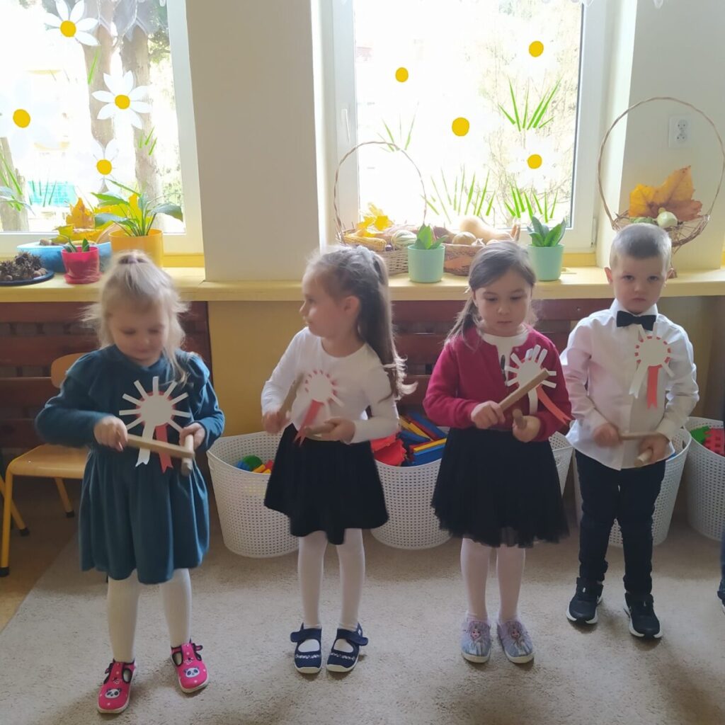 W związku z obchodem Świata Niepodległości dzieci obejrzały film edukacyjny „Narodowe Święto Niepodległości”, zostały zapoznaje z symbolami narodowymi i zrobiły chorągiewki w barwach narodowych. W dniu uroczystości zaśpiewały Hymn Polski i zaprezentowały utwór muzyczny wykonany na instrumentach perkusyjnych.